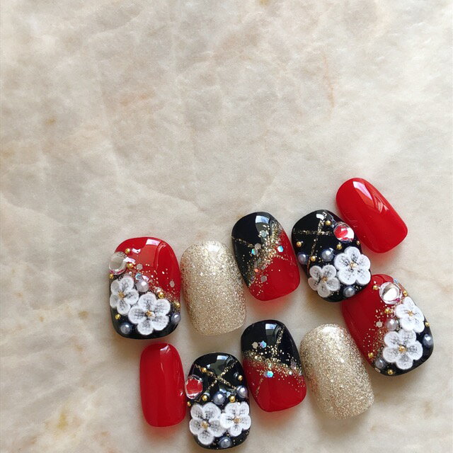 ネイルチップ|赤 ブラック・レッド・ゴールドフラワー和柄短い爪ベリーショートからロングチップのつけ爪選べるサイズでぴったりネイルジェルネイルでワンランク上のチップを是非!浴衣ネイルやブライダルネイルにも大人気!