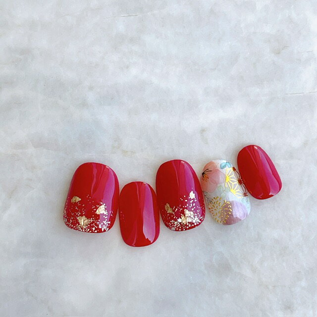 ネイルチップ|赤レッドゴールドブラックフラワーネイル短い爪ベリーショートからロングチップのつけ爪選べるサイズでぴったりネイルジェルネイルでワンランク上のチップを是非!成人式・浴衣やブライダルにも人気!